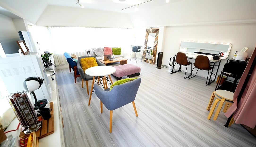 リビングのようなくつろいだ雰囲気のフリースペースがあり、チェアやテーブルなどのセットもあるので小規模の撮影配信に便利。2階の撮影風景のモニタリングに活用することもできます。また3階ではメイクルームやフィッティングルームも完備しています。