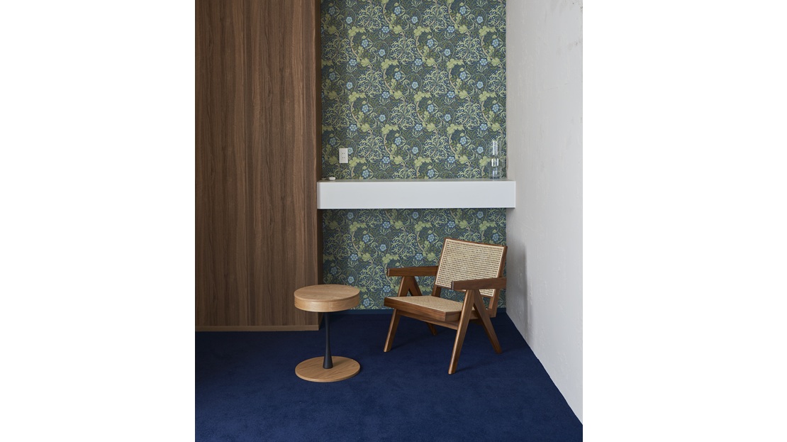 ウィリアムモリス柄の壁紙と重厚なネイビーカーペットが目を惹くベッドルーム。